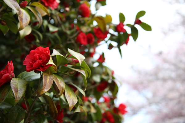 上の写真、椿ですが、左側の花にピントが合っていて、右側の桜がぼけています。