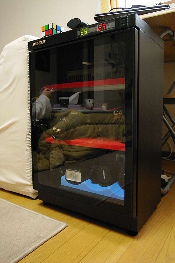 背景のPCディスプレイの電源ランプがきれいな「玉ぼけ」になる事で、いかにも「ボケてる」感が出ます。