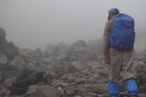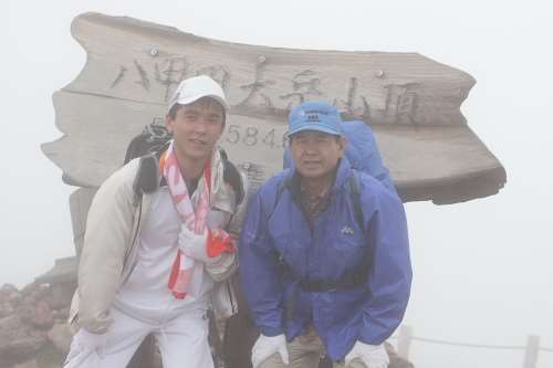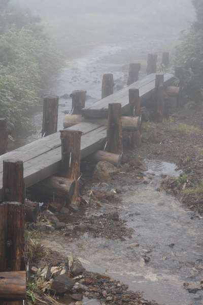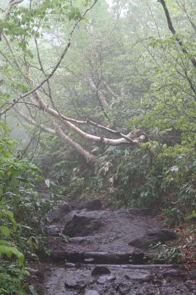 雨なのか汗なのか霧なのか、顔も体もずぶ濡れで、帽子から水滴がしたたります。