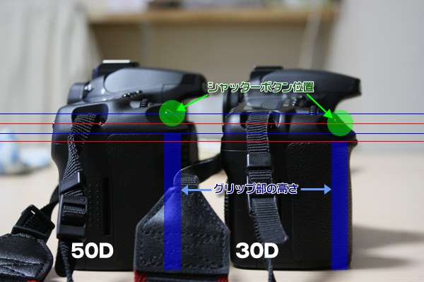で、並べて測ってみたところ、やっぱり50Dと30Dではグリップ部近辺の形状がだいぶ違います。