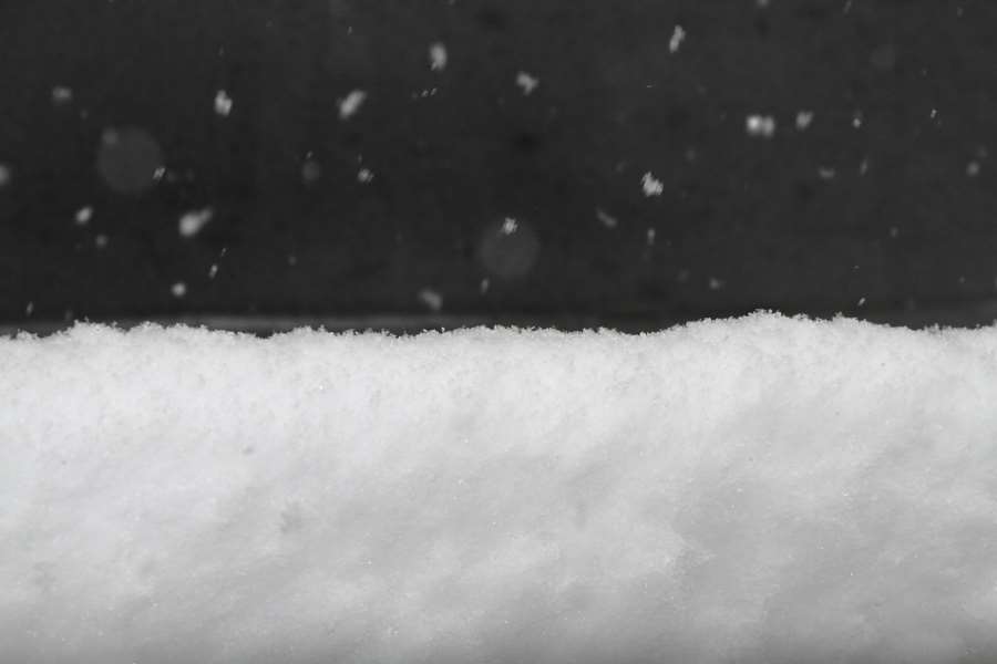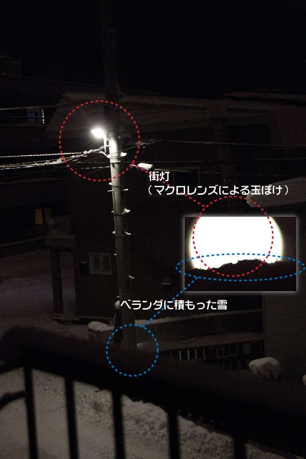 「夜、街灯の玉ぼけを作って、ベランダに積もった雪の輪郭を撮った」が正解です。