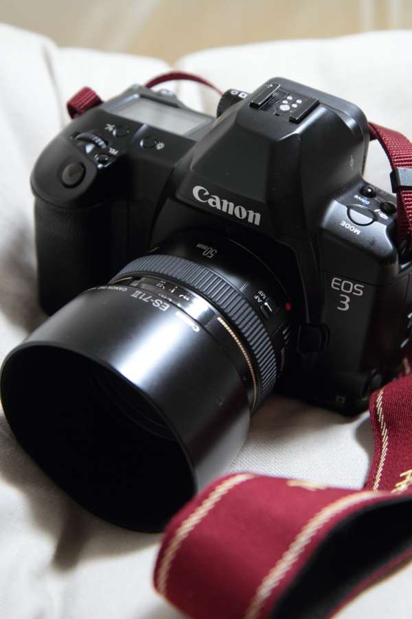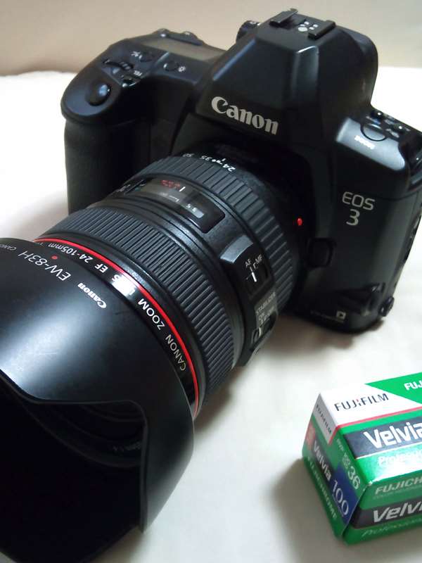 EOS-3、少々古いフィルムカメラとは言え、EOS-1に次ぐ上級機。カメラとしての性能は7D・5D2を上回る部分もあります。