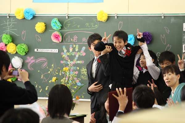 式が終わってから教室へ行くと、友達に担ぎ上げられて楽しそうだった息子。