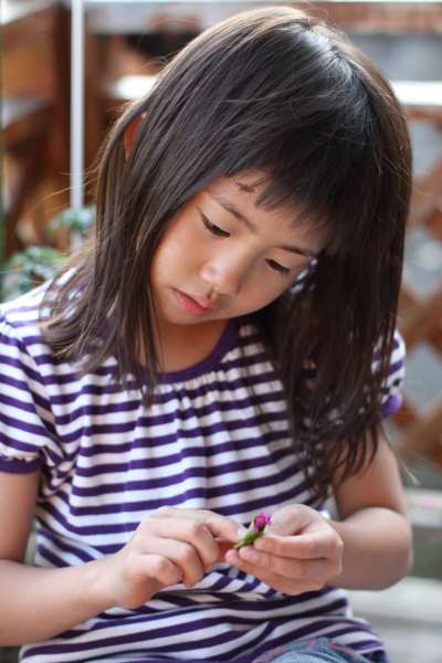 娘、友達と一緒に家の前の庭から草花を摘んで、何か作ってました。