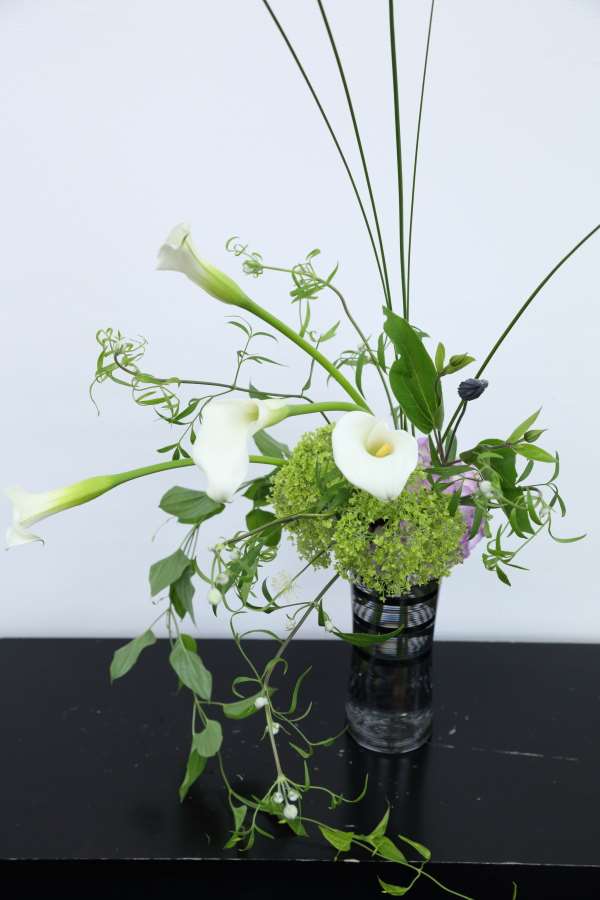 「器・花選びの段階で季節感のあるナチュラルでモダンなイメージをし、生けた結果は予定通りの仕上がり。欲を言えばドランディが咲いてほしい」